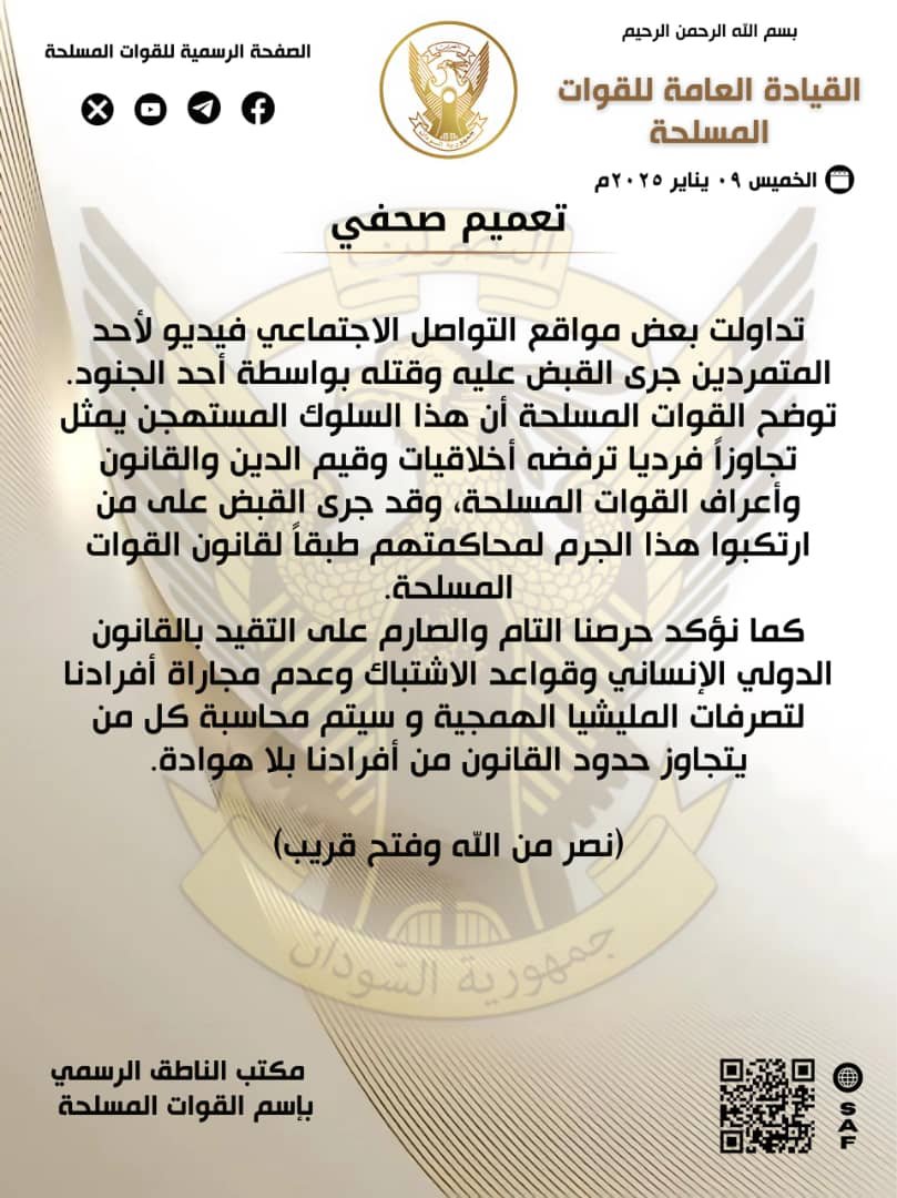 قال الجيش السوداني، أن الفيديو الذي تم تداوله على بعض مواقع التواصل الاجتماعي، لأحد المتمردين جرى القبض عليه وقتله بواسطة أحد الجنود، يمثل تجاوزاً فرديا، ترفضه أعراف المؤسسة العسكرية.