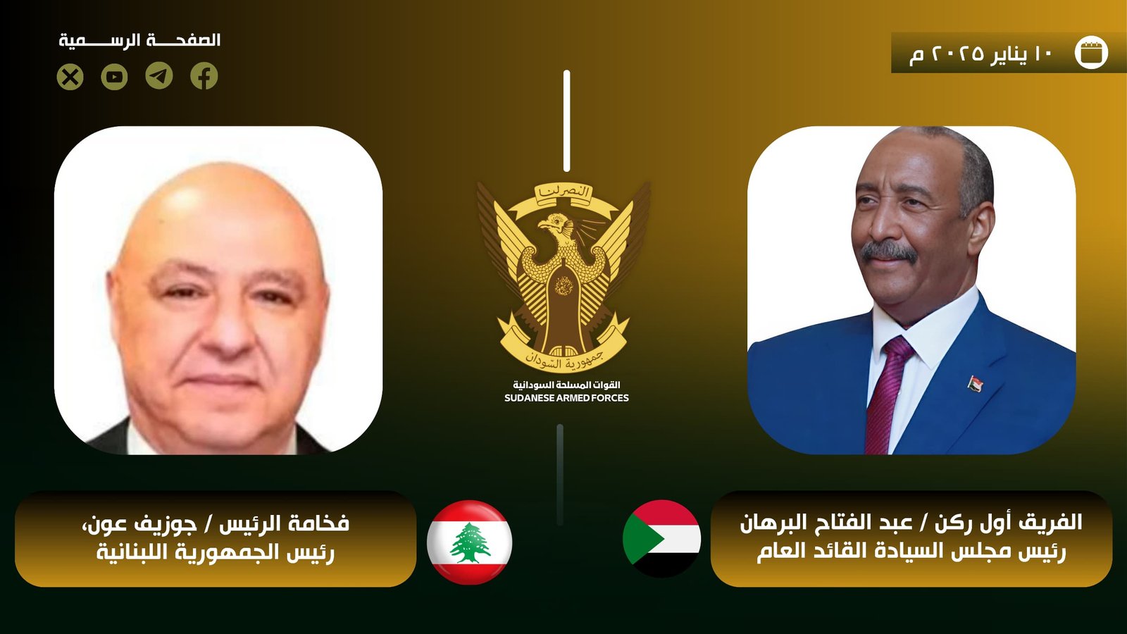 بعث السيد رئيس مجلس السيادة الإنتقالي القائد العام للقوات المسلحة الفريق أول ركن عبدالفتاح البرهان ، برقية تهنئة إلى فخامة الرئيس جوزيف عون، بمناسبة انتخابه رئيساً للجمهورية اللبنانية، متمنياً له التوفيق، وللعلاقات بين البلدين دوام التطور والنماء.
