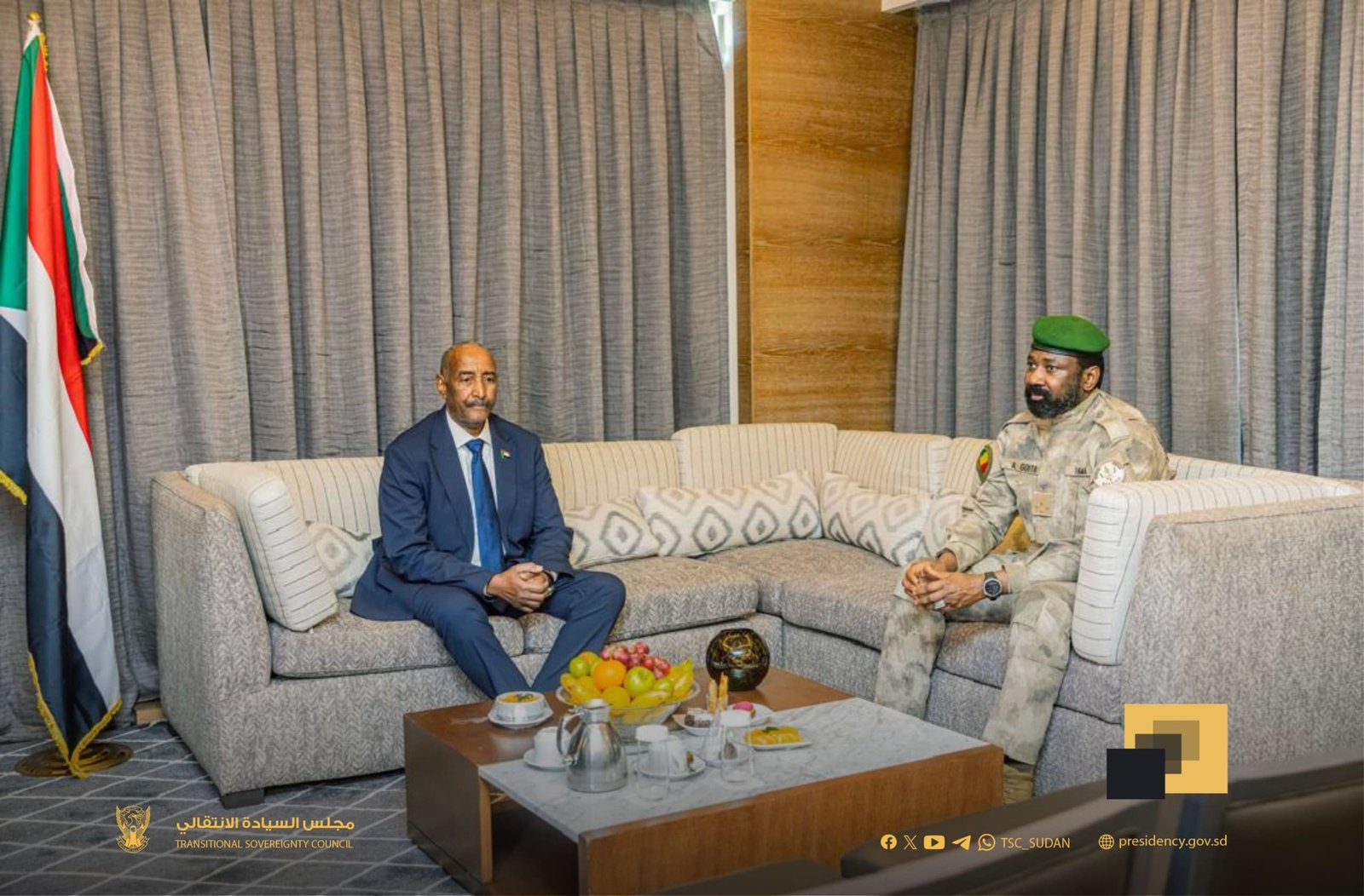 إنعقد اليوم بمدينة باماكو عاصمة جمهورية مالي المباحثات المشتركة بين السودان ومالي، حيث رأس الجانب السوداني رئيس مجلس السيادة الانتقالي الفريق أول الركن *عبدالفتاح البرهان* ، فيما رأس جانب جمهورية مالي الرئيس *أسيمي غويتا*. حيث تركزت المباحثات حول علاقات البلدين وآليات تعزيز التعاون المشترك.