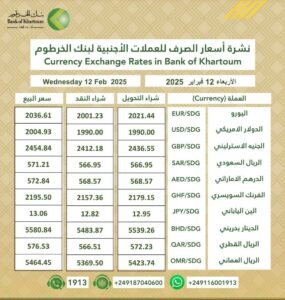 تعرف على أسعار الصرف للعملات الأجنبية في بنك الخرطوم ليوم الأربعاء، الموافق 12 فبراير 2025م.