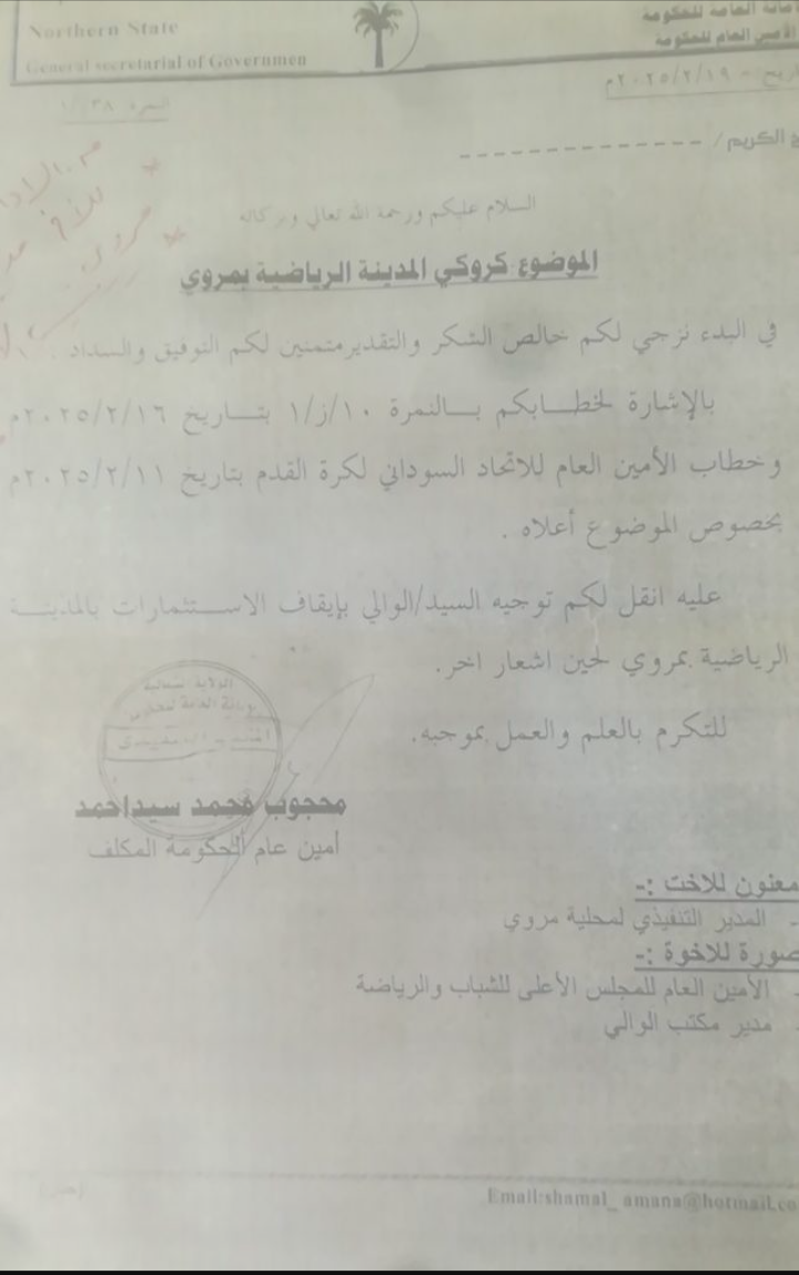 تحت ضغطٍ شعبيٍّ من شباب وأعيان محلية مروي بالولاية الشمالية، أصدر والي الشمالية قرارًا بإيقاف الاستثمار في المدينة الرياضية.