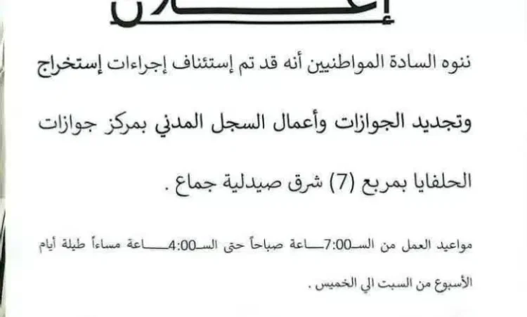 أعلنت الإدارة العامة للجوازات والهجرة عن استئناف العمل بمركز جوازات الحلفايا في مربع (7) بشرق النيل، شرق صيدلية جماع، لتقديم خدمات استخراج وتجديد الجوازات إلى جانب أعمال السجل المدني.