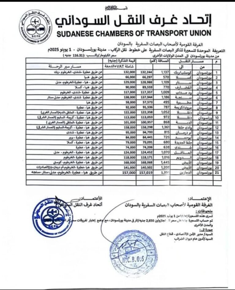 بالتنسيق مع إتحاد غرف النقل السوداني، أعلنت الغرفة القومية لأصحاب البصات السفرية في السودان، عن زيادة جديدة في أسعار تذاكر السفر عبر البصات السفرية.