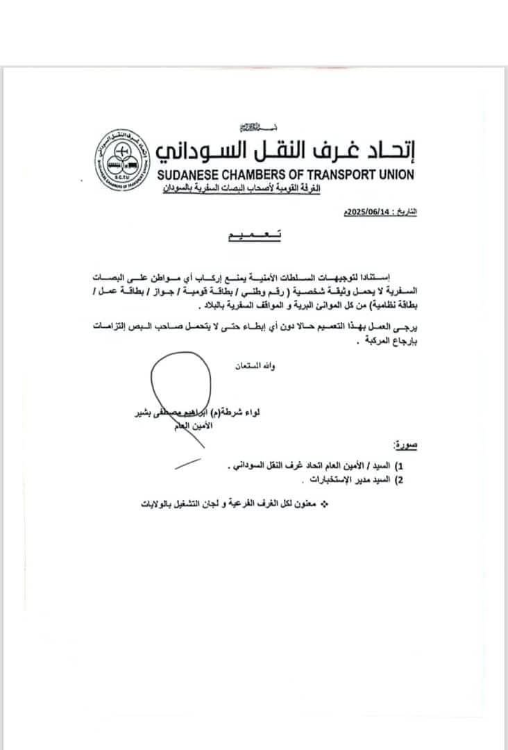 أصدر اتحاد غرف النقل السوداني، ممثلاً في الغرفة القومية لأصحاب البصات السفرية، تعميماً أمنياً عاجلاً يلزم شركات النقل والبصات السفرية بعدم إركاب أي راكب ما لم يكن حاملاً لوثيقة إثبات هوية رسمية