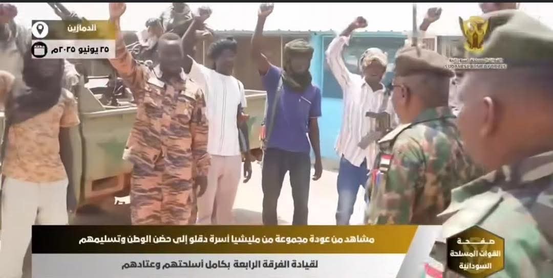 سلّمت مجموعة تابعة لمليشيا أسرة دقلو نفسها بكامل أسلحتها وعتادها إلى قيادة الفرقة الرابعة مشاة بالدمازين، برئاسة القائد الهادي جكة.