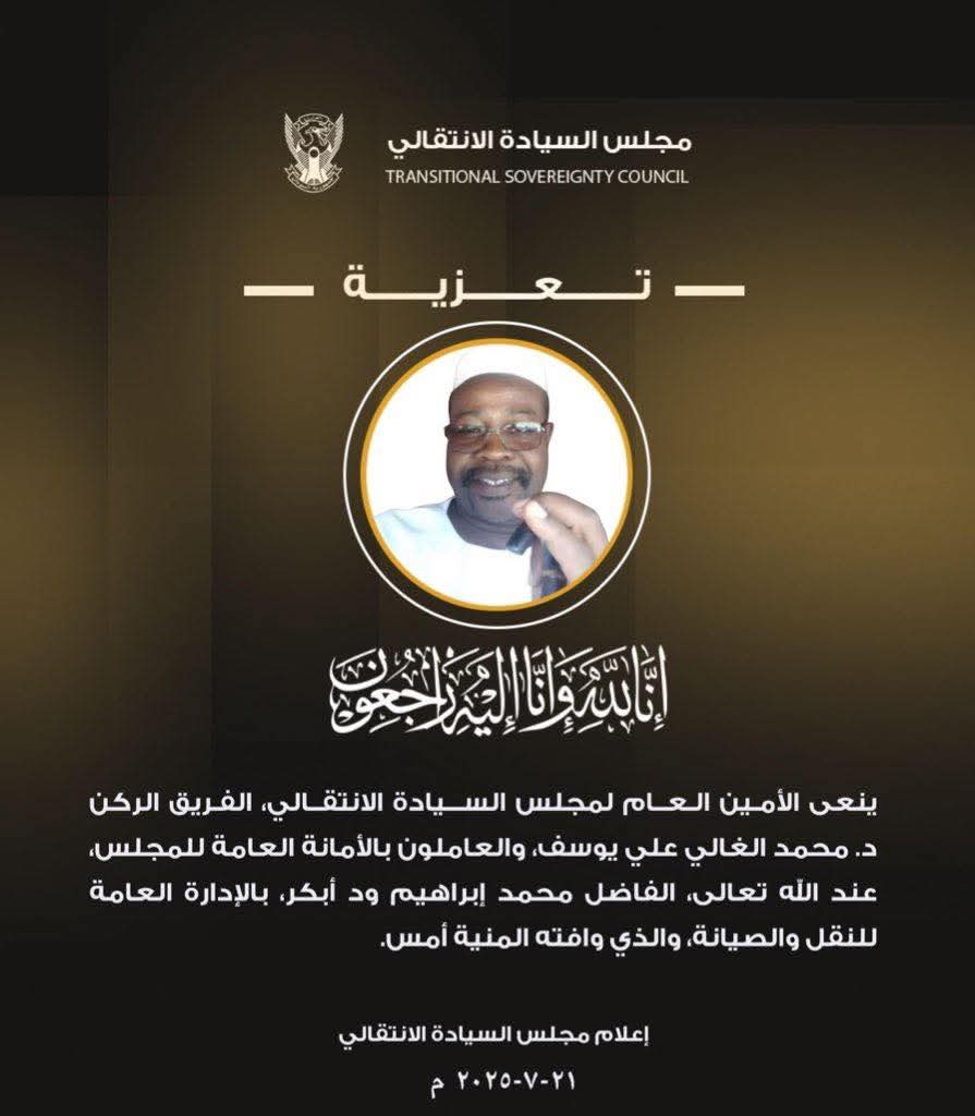وتقدم الأمين العام لمجلس السيادة، الفريق الركن د. محمد الغالي علي يوسف، والعاملون بالأمانة العامة، بخالص التعازي والمواساة لأسرة الفقيد وزملائه، مؤكدين أن رحيله فقد كبير للمؤسسة.
