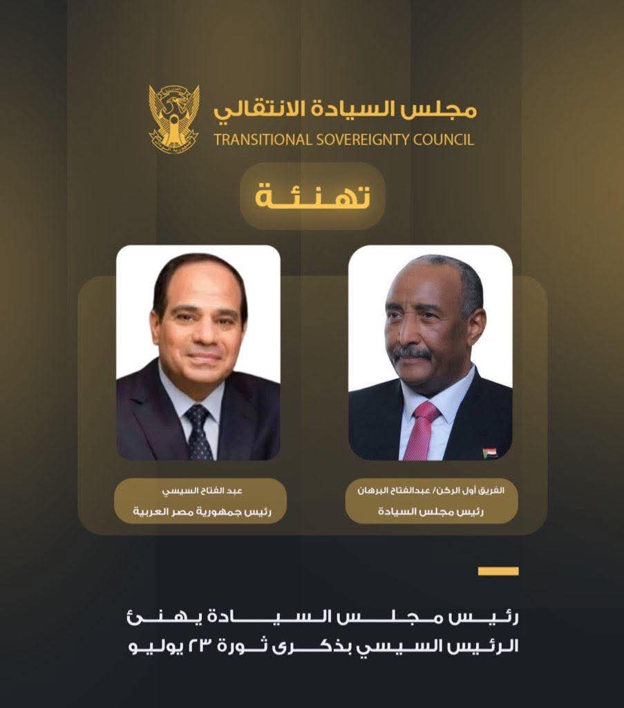 بعث رئيس مجلس السيادة الانتقالي القائد العام للقوات المسلحة، الفريق أول ركن عبدالفتاح البرهان، برقية تهنئة إلى رئيس جمهورية مصر العربية، فخامة الرئيس عبدالفتاح السيسي، بمناسبة الذكرى الـ72 لثورة 23 يوليو المجيدة.