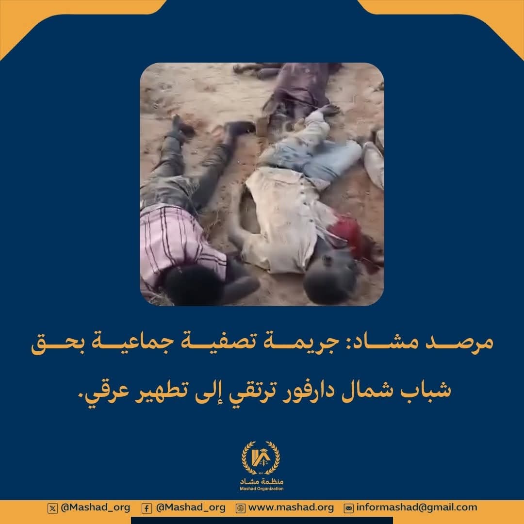 أدان مرصد مشاد بأشد العبارات الجريمة المروعة التي ارتكبتها صباح اليوم قوات الدعم السريع والميليشيات المتحالفة معها، والتي راح ضحيتها أكثر من 16 شابًا من أبناء شمال دارفور، واصفًا الواقعة بأنها ترقى إلى جريمة تطهير عرقي مكتملة الأركان وانتهاك جسيم للقانون الدولي الإنساني وحقوق الإنسان.