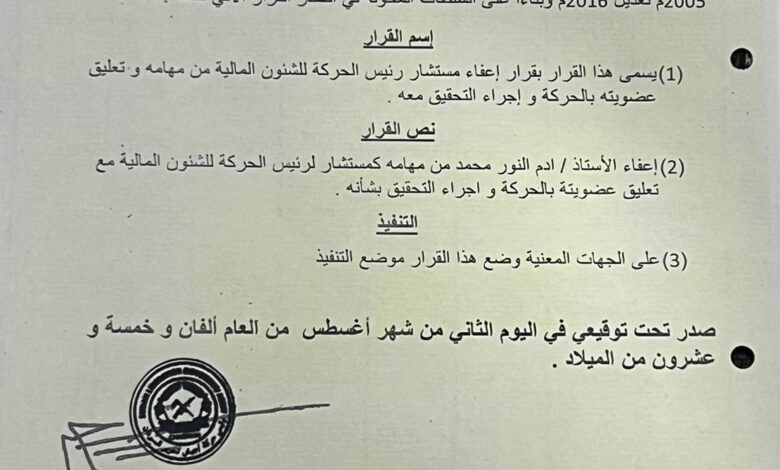 وشملت القرارات إعفاء مساعد الرئيس للشؤون القانونية محمد محمود كورينا، و مستشار رئيس الحركة للشؤون المالية آدم النور محمد، بالإضافة إلى إعفاء المستشار الإعلامي محمد عبدالله أبكر من مهامه.