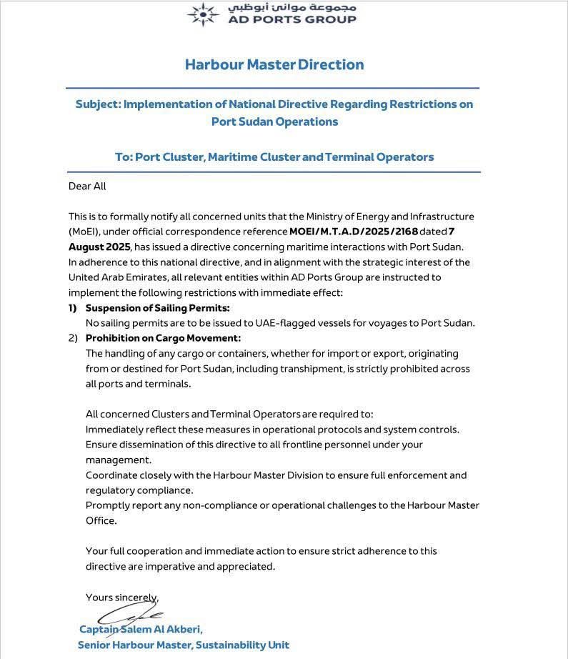 أعلنت وزارة الطاقة والبنية التحتية بدولة الإمارات فرض قيود فورية على التعامل مع ميناء بورتسودان، تشمل إيقاف إصدار تصاريح الإبحار للسفن الإماراتية المتجهة إليه، ومنع مناولة أي بضائع أو حاويات واردة أو صادرة من الميناء، بما في ذلك الشحن العابر، في جميع الموانئ الإماراتية.
