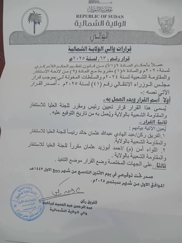 أصدر والي الولاية الشمالية، الفريق ركن عبد الرحمن عبد الحميد إبراهيم، اليوم الاثنين، قرارًا بحل اللجنة العليا للاستنفار والمقاومة الشعبية، إلى جانب حل اللجان الفرعية التابعة لها والمشكلة بموجب القرار رقم (53) لسنة 2024م.