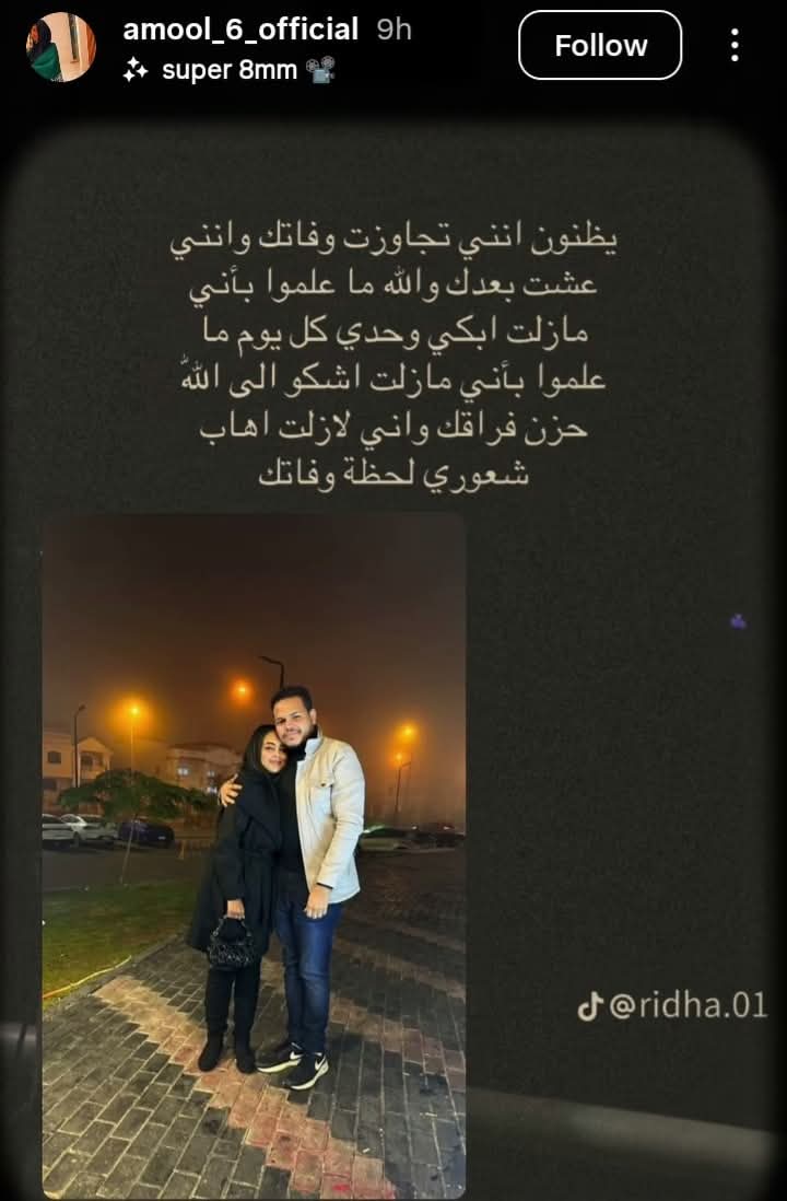“أنا أعلنت خبر وفاته منذ اليوم الأول، وعدم متابعة البعض ليس مشكلتي. وعندما خرجت من الحبس نشرت الخبر في (ستوري) بانتهاء عدتي، وكذلك عند مرور عام على وفاته. وكل جمعة أنشر دعاءً له بالرحمة في نفس الاستوري”.