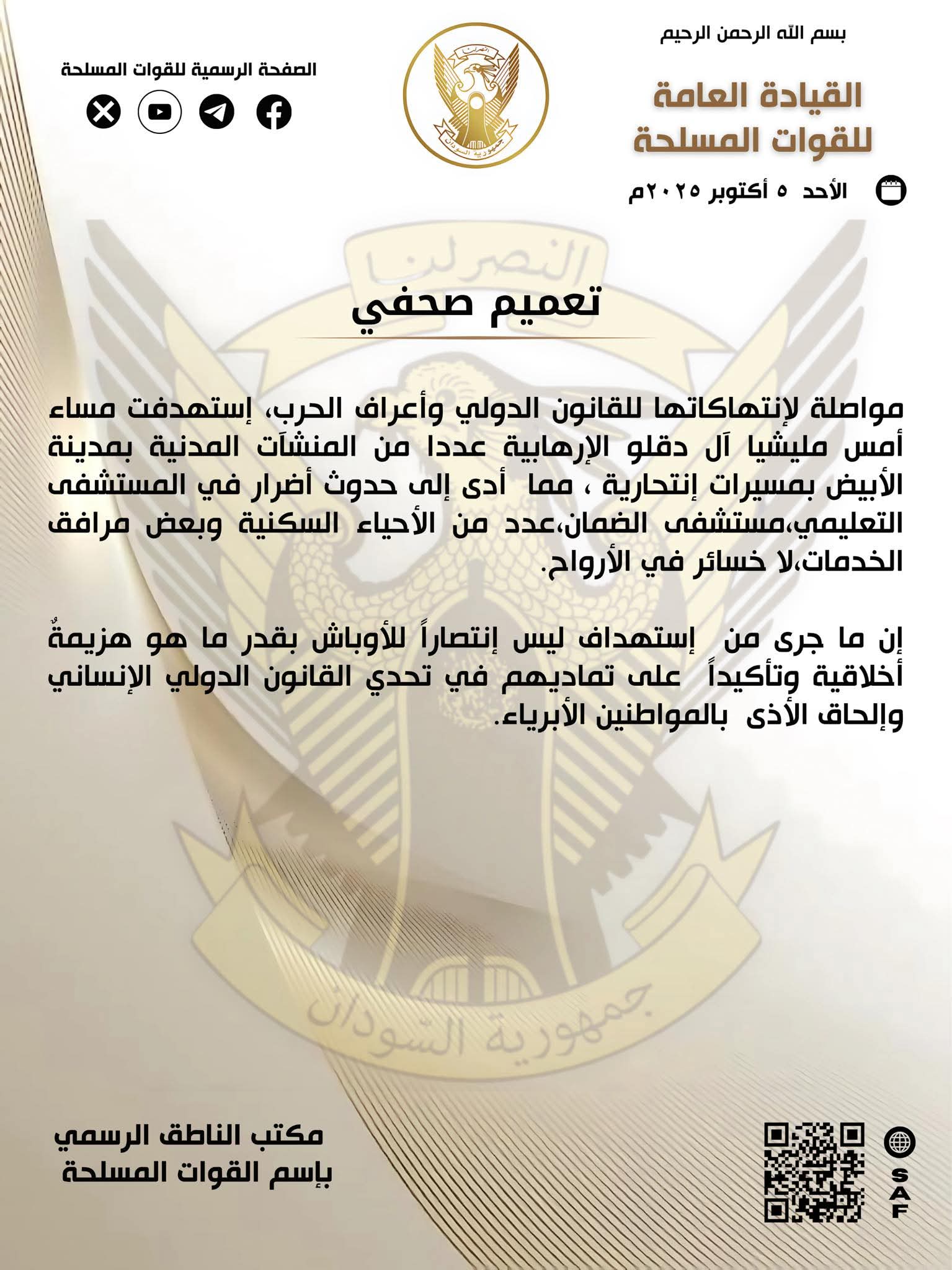 واعتبر في بيان أن هذا الاستهداف يعد هزيمة أخلاقية للدعم السريع، وتأكيد على تماديها في تحدي القانون الدولي الإنساني وإلحاق الأذى بالمواطنين