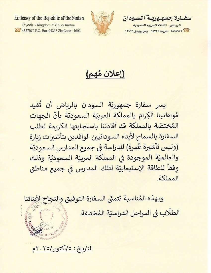 أعلنت سفارة جمهورية السودان بالرياض، أن الجهات المختصة في المملكة العربية السعودية استجابت لطلب السفارة، مما يتيح لأبناء السودانيين الحاصلين على تأشيرات زيارة – وليس تأشيرات عمرة – الالتحاق بالدراسة في جميع المدارس السعودية والدولية المنتشرة في المملكة.