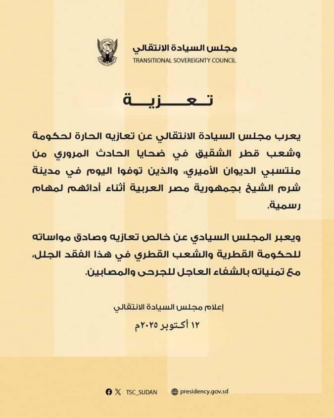 أعرب مجلس السيادة الانتقالي عن تعازيه الحارة لحكومة وشعب قطر الشقيق في ضحايا الحادث المروري الذي وقع أمس بمدينة شرم الشيخ بجمهورية مصر العربية، والذي أودى بحياة عدد من منتسبي الديوان الأميري القطري أثناء أداء مهامهم الرسمية.
