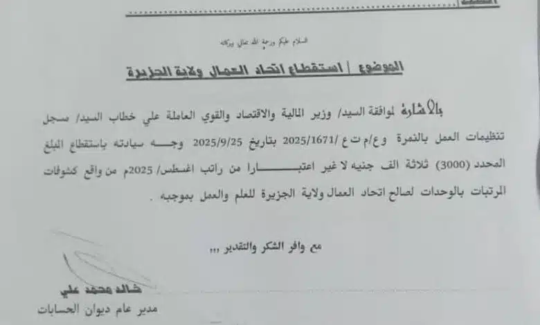 أصدرت حكومة ولاية الجزيرة قرارًا مثيرًا للجدل يقضي بتنفيذ استقطاعٍ شهريٍّ من رواتب العاملين بالولاية، بواقع 3000 جنيه لصالح اتحاد نقابات عمال الولاية، و800 جنيه للصندوق القومي لرعاية الطلاب، ليصل إجمالي المبلغ المستقطع شهريًا إلى أكثر من 120 مليار جنيه سوداني، من أجور ما يزيد على 55 ألف عامل.