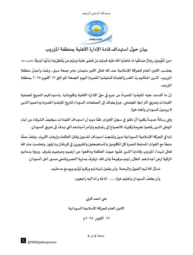 إننا في الحركة الإسلامية السودانية ندينُ ونَشجبُ استهدافَ المدنيينَ وقتلَ الحكماءِ وإرهابَ الأبرياءِ، ونقفُ صفًّا منيعًا مع القواتِ المسلحةِ لنصرةِ كلِّ المكلومينَ والمستضعفينَ والمقهورينَ في كردفانَ ودارفورَ. ونحتسبُ عندَ اللهِ تعالى شهداءَ المزروبِ وقادتها الذين غلّبوا صوتَ الحكمةِ ودافعوا عن أرضهم وعرضهم بشرفٍ، وروَوا بدمائهم الزكيةِ أرضَ أجدادهم، لتظلَّ رايتهم مرفوعةً بإذنِ اللهِ، ترفرفُ بساريةِ النصرِ وتشفي صدور أهلِ السودانِ.