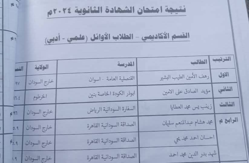 وكشف وزير التربية والتعليم خلال المؤتمر عن الطالبة الأولى على مستوى السودان رهف الأمين الطيب من القنصلية العامة بأسوان – جمهورية مصر العربية، التي أحرزت نسبة 97٪، متصدرةً قائمة الأوائل لهذا العام.
