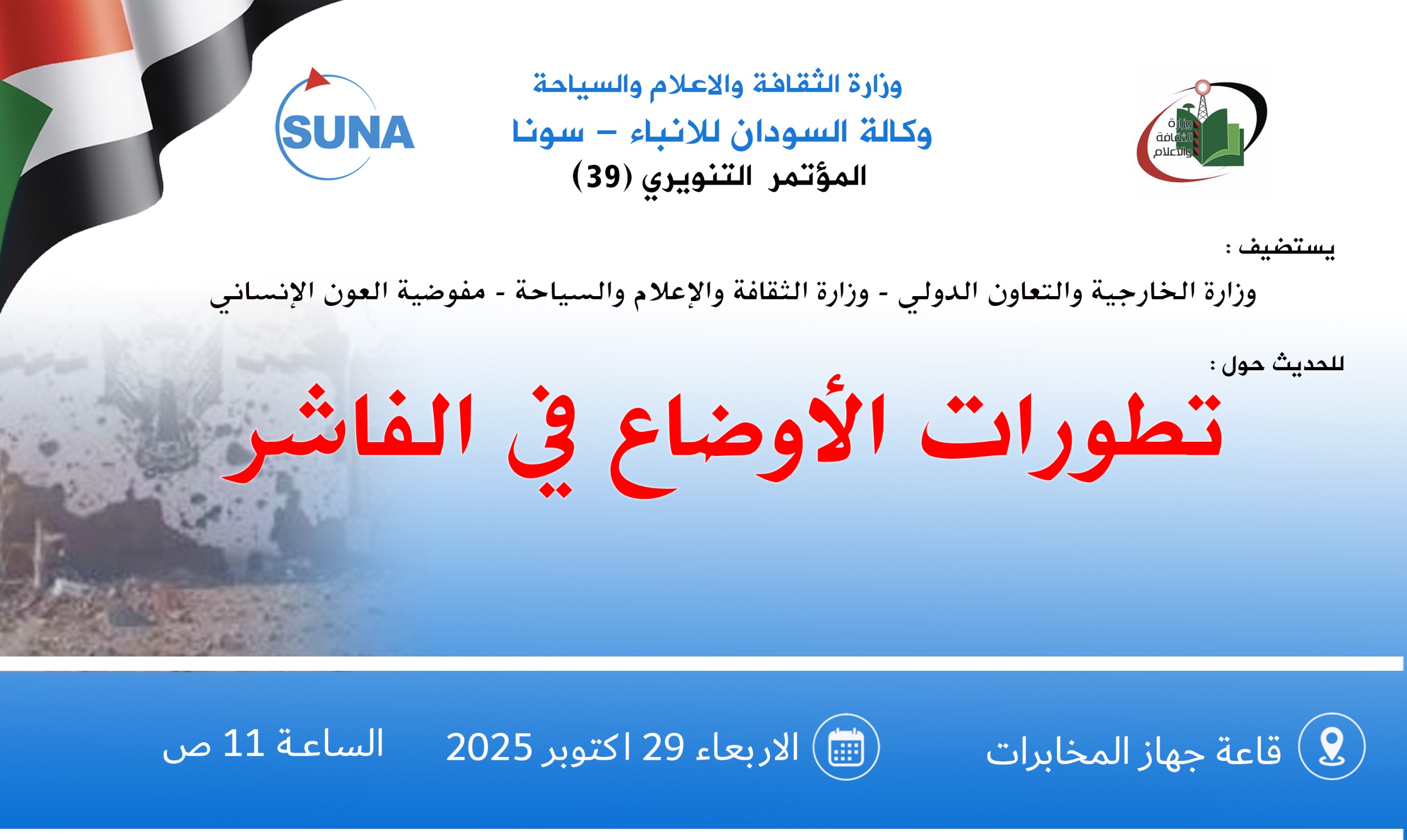ويهدف المؤتمر إلى إطلاع المواطنين على آخر التطورات في مدينة الفاشر، وبيان الجهود الحكومية والإنسانية المبذولة لمواجهة الأزمة، إلى جانب تصحيح الشائعات والمعلومات المضللة المتداولة.