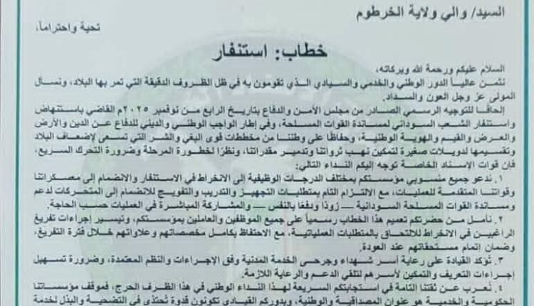 ودعا المصباح في خطاب موجه إلى والي الخرطوم جميع منسوبي المؤسسات بمختلف الدرجات الوظيفية إلى الانخراط في الاستنفار والانضمام إلى معسكرات القوات المتقدمة للعمليات، مع الالتزام التام بمتطلبات التجهيز والتدريب والتفويج للانضمام إلى المتحركات لدعم ومساندة القوات المسلحة السودانية – زودا ودفعا بالنفس – والمشاركة المباشرة في العمليات حسب الحاجة.