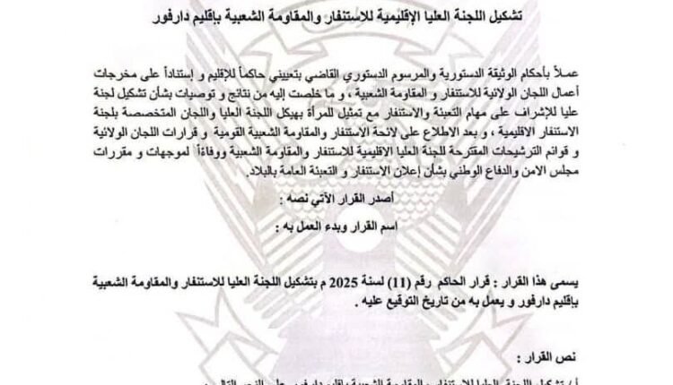 أصدر حاكم إقليم دارفور، مني أركو مناوي، قراراً بتشكيل اللجنة العليا للاستنفار والمقاومة الشعبية بإقليم دارفور.