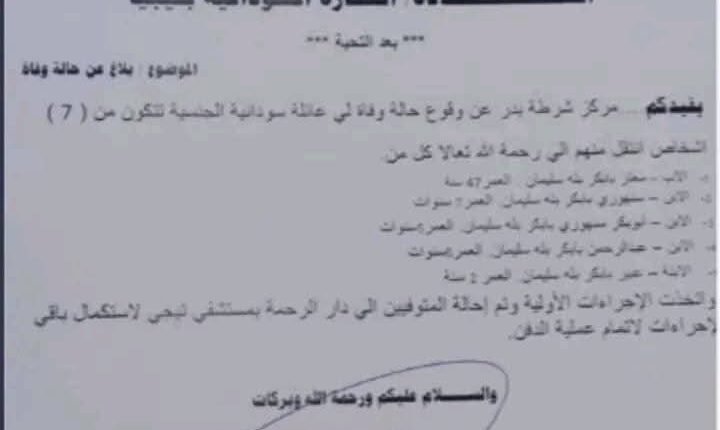 وأشار البلاغ المرسل إلى السفارة السودانية إلى أن الأسرة، التي تتكون من سبعة أفراد، تعرضت للاختناق، ما أدى إلى وفاة الأب، معتز بابكر بلة سليمان (47 عاماً)، وأربعة من أبنائه، بينما جرى نقل الجثامين إلى دار الرحمة بمستشفى تيجي لاستكمال الإجراءات القانونية والطبية.