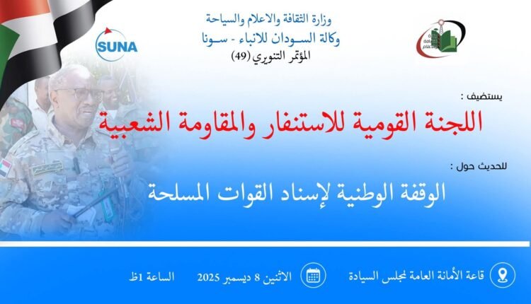 يستضيف المؤتمر التنويري الـ 49 لوزارة الثقافة والإعلام والسياحة، الذي تنظمه وكالة السودان للأنباء، في الواحدة من ظهر غد الاثنين، اللجنة القومية للاستنفار والمقاومة الشعبية.