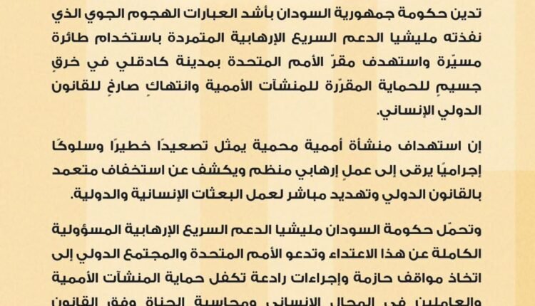 أعربت حكومة جمهورية السودان عن إدانتها القاطعة للهجوم الجوي الذي شنّته مليشيا الدعم السريع المتمردة المصنفة إرهابية، باستخدام طائرة مسيّرة، مستهدفةً مقرّ الأمم المتحدة بمدينة كادقلي، واصفةً الهجوم بأنه انتهاك بالغ الخطورة للحصانات والضمانات الممنوحة للمنشآت الأممية بموجب القانون الدولي الإنساني.