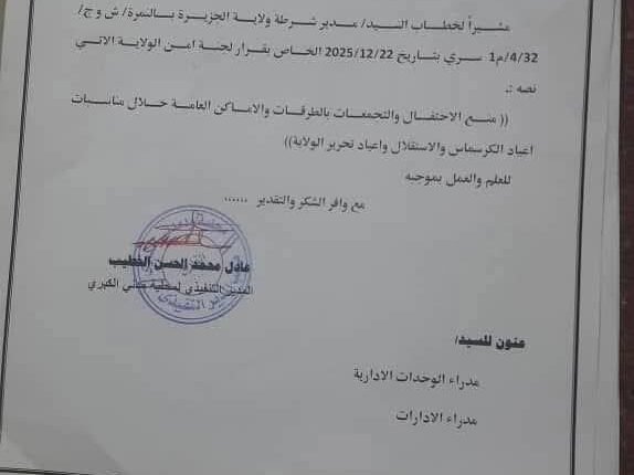 وبحسب خطاب رسمي صادر عن مكتب المدير التنفيذي للمحلية، بتاريخ 22 ديسمبر 2025، جاء القرار في إطار التدابير الأمنية والاحترازية الرامية للحفاظ على الأمن والاستقرار والسلامة العامة بالمحلية.
