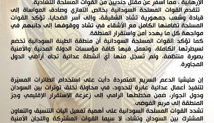 وأكد البيان أن منطقة الطينة السودانية تخضع للسيطرة الكاملة للقوات المسلحة، وتعمل فيها جميع مؤسسات الدولة المدنية والأمنية بصورة منتظمة، مشدداً على أنه لم تُسجَّل أي أنشطة عدائية من داخل الأراضي السودانية تجاه دول الجوار.