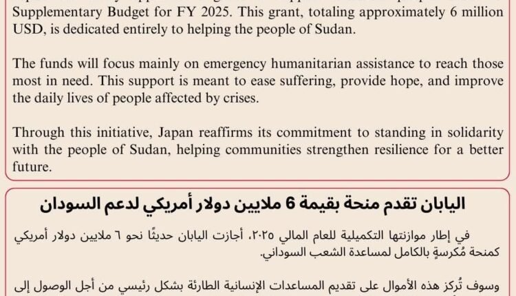 أعلنت الحكومة اليابانية عن تقديم منحة للعون الإنساني للسودان بقيمة 6 مليون دولار ، وذلك في اطار دعمها المستمر والمتواصل للشعب السوداني.