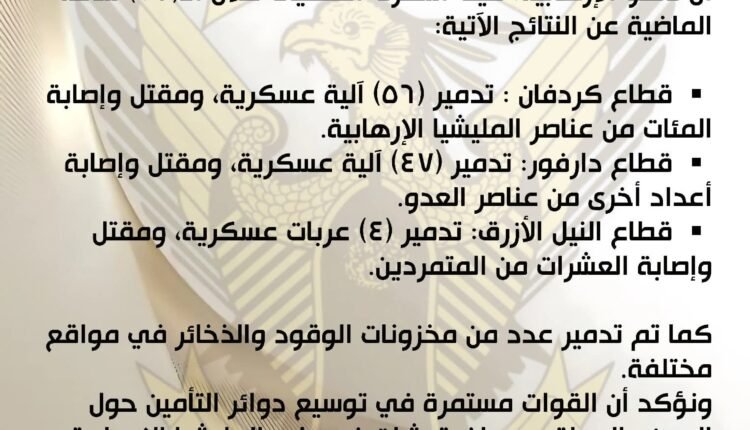 وأشار البيان إلى أن العمليات العسكرية شملت كذلك تدمير مخزونات كبيرة من الوقود والذخائر في مواقع متعددة، ما أسهم في إضعاف قدرات الدعم السريع القتالية.