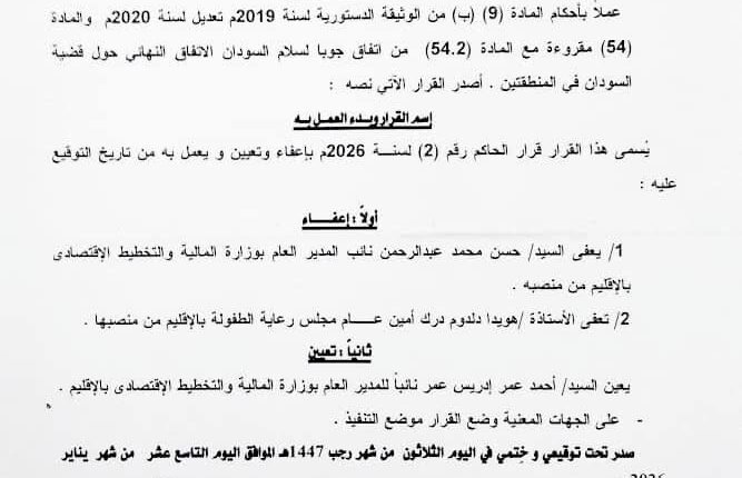 أصدر الحاكم قرارًا إداريًا رقم (2) لسنة 2026م، تضمن مجموعة من الإعفاءات والتعيينات في مناصب قيادية بالإقليم.