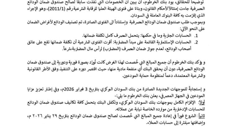 أولا: الإلتزام الكامل بموجهات بنك السودان المركزي، وتكفل البنك بتحمل كافة تكاليف صندوق ضمان الودائع للحسابات الإدخارية من موارده الخاصة نيابة عن عملائه. ثانيا: الشروع فوراً في إعادة جميع المبالغ التي خُصمت لصالح صندوق ضمان الودائع بتاريخ ۲۹ یناير ٢٠٢٦ م، وإضافتها مباشرة إلى حسابات العملاء.