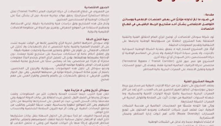 أولا. فإن المشروع المشار إليه لا يتعلق بتغذية الشبكة الوطنية السودانية بالإنترنت. ولا يمس سيادة الدولة الرقمية، ولا يتدخل في المقاسم الوطنية أو حركة المستخدمين داخل السودان أو أي دولة أخرى.