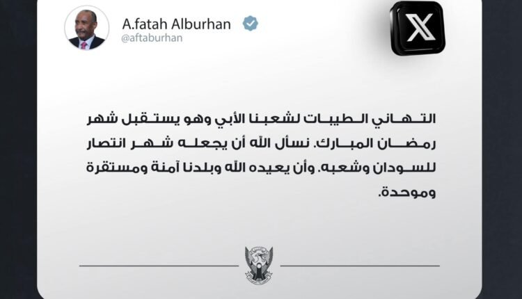 “التهاني الطيبات لشعبنا الأبي وهو يستقبل شهر رمضان المبارك. نسأل الله أن يجعله شهر انتصار للسودان وشعبه، وأن يعيده الله وبلدنا آمنة ومستقرة وموحدة.”