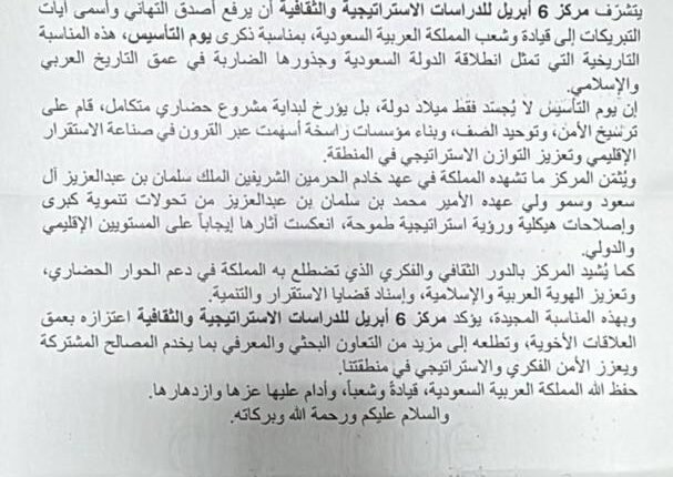 يتشرّف مركز 6 أبريل للدراسات الاستراتيجية والثقافية أن يرفع أصدق التهاني وأسمى آيات التبريكات إلى قيادة وشعب المملكة العربية السعودية، بمناسبة ذكرى يوم التأسيس، هذه المناسبة التاريخية التي تمثل انطلاقة الدولة السعودية وجذورها الضاربة في عمق التاريخ العربي والإسلامي.