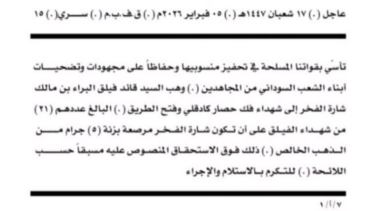 كشفت شارة عسكرية سرية، عن منح قائد فيلق البراء بن مالك المصباح طلحة ابو زيد، شهداء معارك فك حصار كادوقلي وفتح الطريق، البالغ عددهم (21) شهيد شارة الفخر مرصعة بالذهب.