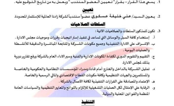 أصدرت شركة زادنا العالمية للاستثمار المحدودة قرار مجلس الإدارة رقم (1) لسنة 2026م، والقاضي بتعيين عضو منتدب للشركة، في خطوة تستهدف تعزيز الامتثال المؤسسي ورفع كفاءة الأداء التنفيذي وتطوير منظومة الإدارة.
