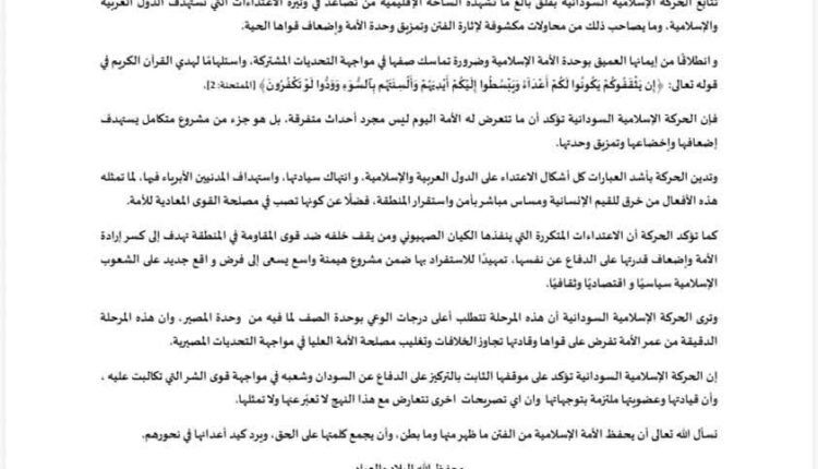 تتابع الحركة الإسلامية السودانية بقلق بالغ ما تشهده الساحة الإقليمية من تصاعد في وتيرة الاعتداءات التي تستهدف الدول العربية والإسلامية، وما يصاحب ذلك من محاولات مكشوفة لإثارة الفتن وتمزيق وحدة الأمة وإضعاف قواها الحية.