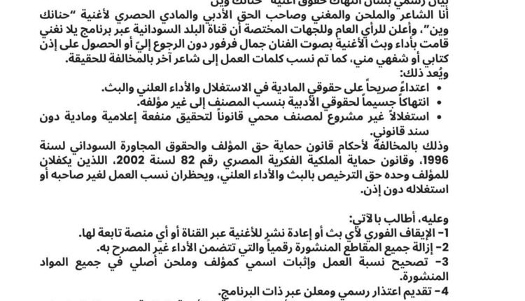 وأشار البيان إلى أن ذلك يمثل مخالفة لأحكام قانون حماية حق المؤلف والحقوق المجاورة السوداني لسنة 1996، وقانون حماية الملكية الفكرية المصري رقم 82 لسنة 2002، اللذين يكفلان للمؤلف وحده حق الترخيص بالبث والأداء العلني، ويحظران نسبة العمل لغير صاحبه أو استغلاله دون إذن.