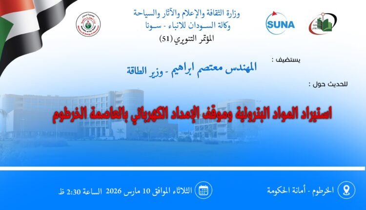 تستضيف وكالة السودان للأنباء غداً الثلاثاء، 10 مارس 2026، وزير الطاقة المهندس معتصم إبراهيم، في المؤتمر التنويري رقم (51)، للحديث حول استيراد المواد البترولية وموقف الإمداد الكهربائي بالعاصمة الخرطوم.