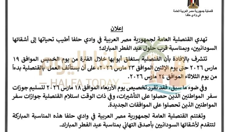 أعلنت القنصلية العامة المصرية في وادي حلفا عن توقفها عن العمل إعتباراً من الخميس 19 مارس وحتى الإثنين 23 مارس، على أن يستأنف العمل بالقنصلية بدءاً من الثلاثاء 24 مارس.