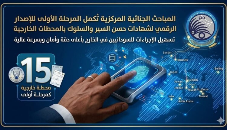 أعلنت الإدارة العامة للمباحث الجنائية المركزية اكتمال المرحلة الأولى من مشروع الإصدار الرقمي لشهادات حسن السير والسلوك (الفيش) عبر عدد من سفارات السودان بالخارج، في خطوة تهدف إلى تسهيل الإجراءات للمواطنين السودانيين المقيمين في دول المهجر.