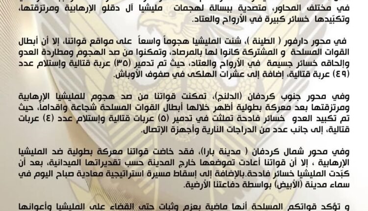 خلال ( ٢٤) ساعة الماضية واصلت قواتكم المسلحة والقوات المشتركة أداء واجبها الوطني في مختلف المحاور، متصدية ببسالة لهجمات مليشيا آل دقلو الإرهابية ومرتزقتها، وتكبّيدها خسائر كبيرة في الأرواح والعتاد.