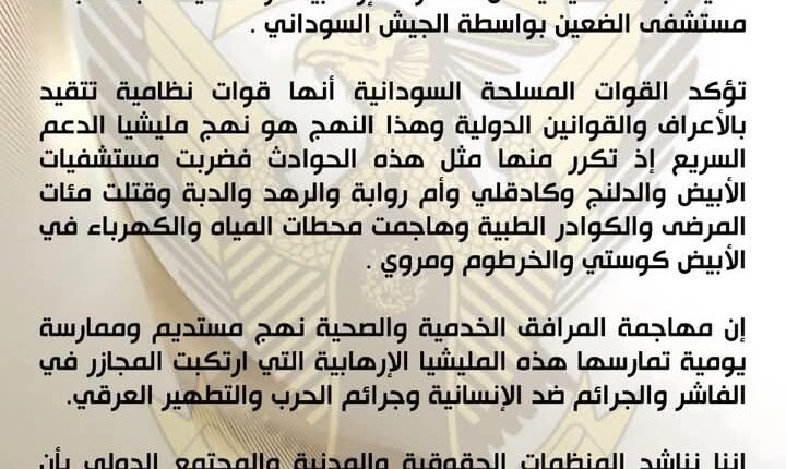أصدرت القيادة العامة للقوات المسلحة السودانية بيانًا نفت فيه بشدة الاتهامات الموجهة لها بشأن مهاجمة مستشفى الضعين، مؤكدة أن الجيش السوداني قوة نظامية تلتزم بالأعراف والقوانين الدولية.