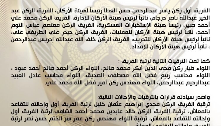 ترقية الفريق الركن مجدي إبراهيم عثمان خليل لرتبة الفريق أول وإحالته للتقاعد بالمعاش.