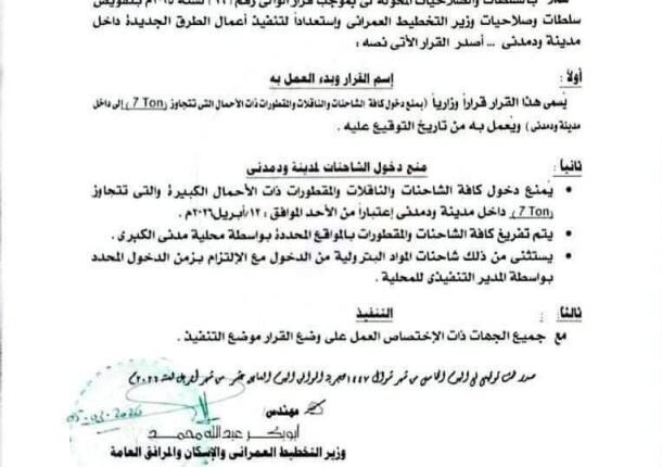 أصدرت حكومة ولاية الجزيرة قرارًا رسميًا يقضي بمنع دخول الشاحنات والناقلات والمقطورات التي تتجاوز حمولتها سبعة أطنان إلى مدينة ود مدني، وذلك اعتبارًا من يوم الأحد المقبل.