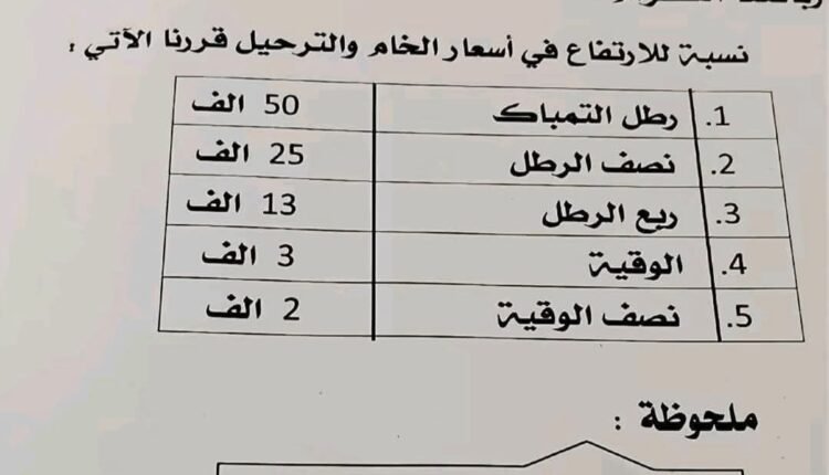 أعلنت الغرف التجارية للتمباك بوادي العشار عن ارتفاع جديد في أسعار “التمباك” محلياً، مع تسجيل أن جميع أكياس التمباك باتت لا تقل أسعارها عن 2000 جنيه.