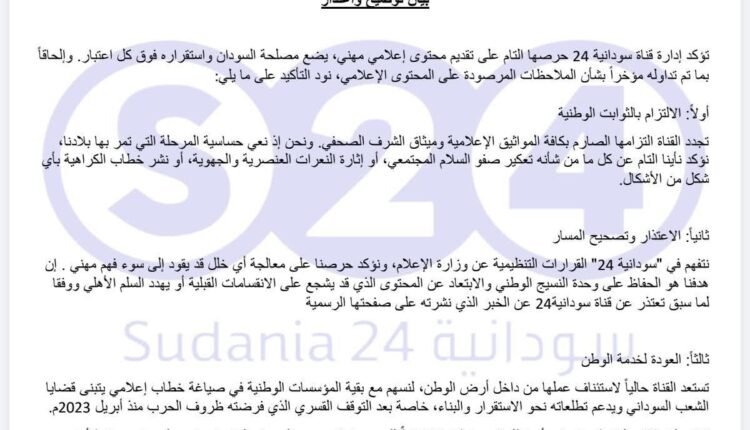 أصدرت قناة سودانية 24 بيان توضيح واعتذار لجمهورها داخل وخارج السودان، أكدت فيه حرصها على تقديم محتوى إعلامي مهني يضع مصلحة البلاد واستقرارها في مقدمة أولوياتها، وذلك على خلفية ملاحظات أُثيرت مؤخراً حول بعض المواد المنشورة.